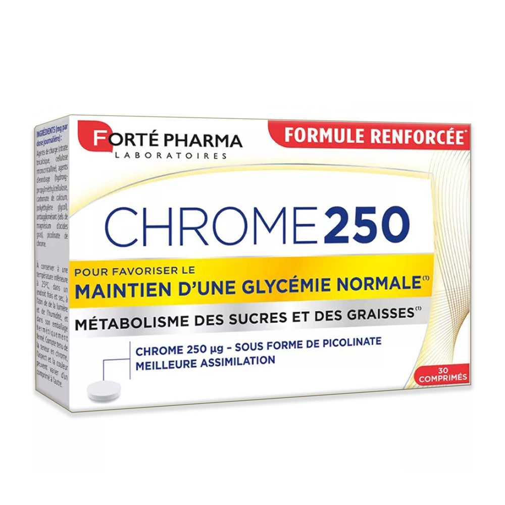 Το Chrome 250 της Forte Pharma είναι ένα διατροφικό συμπλήρωμα χρωμίου σε πικολινική μορφή για βέλτιστη απορρόφηση. Βοηθά στον καλύτερο μεταβολισμό του σακχάρου στο αίμα ενώ μπορεί να συμβάλλει στη διαχείριση της ανάγκης για τσιμπολόγημα σνακς ή γλυκών.