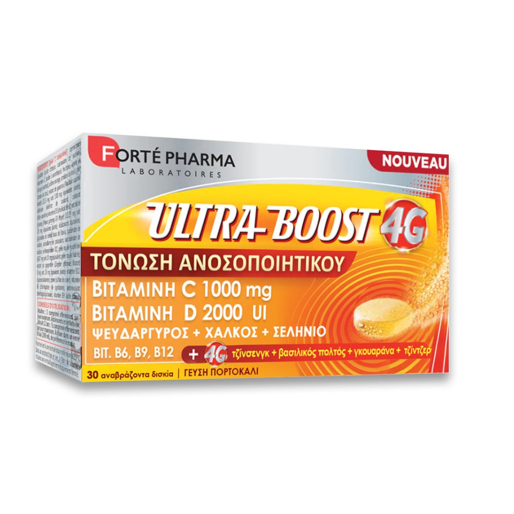 Η φόρμουλα του UltraBoost 4G αποτελεί ένα Booster του ανοσοποιητικού, συνδυάζοντας την αποτελεσματικότητα του φυτικού τονωτικού συμπλόκου 4G (βασιλικός πολτός, γκουαρανά, τζινσενγκκαι τζίντζερ), με ισχυρή δόση (1000mg) βιταμίνης C, βιταμίνης D, μείγμα βιταμινών του συμπλέγματος Β και μετάλλων, για διπλή δράση τόνωσης της ενέργειας και της ανοσίας.